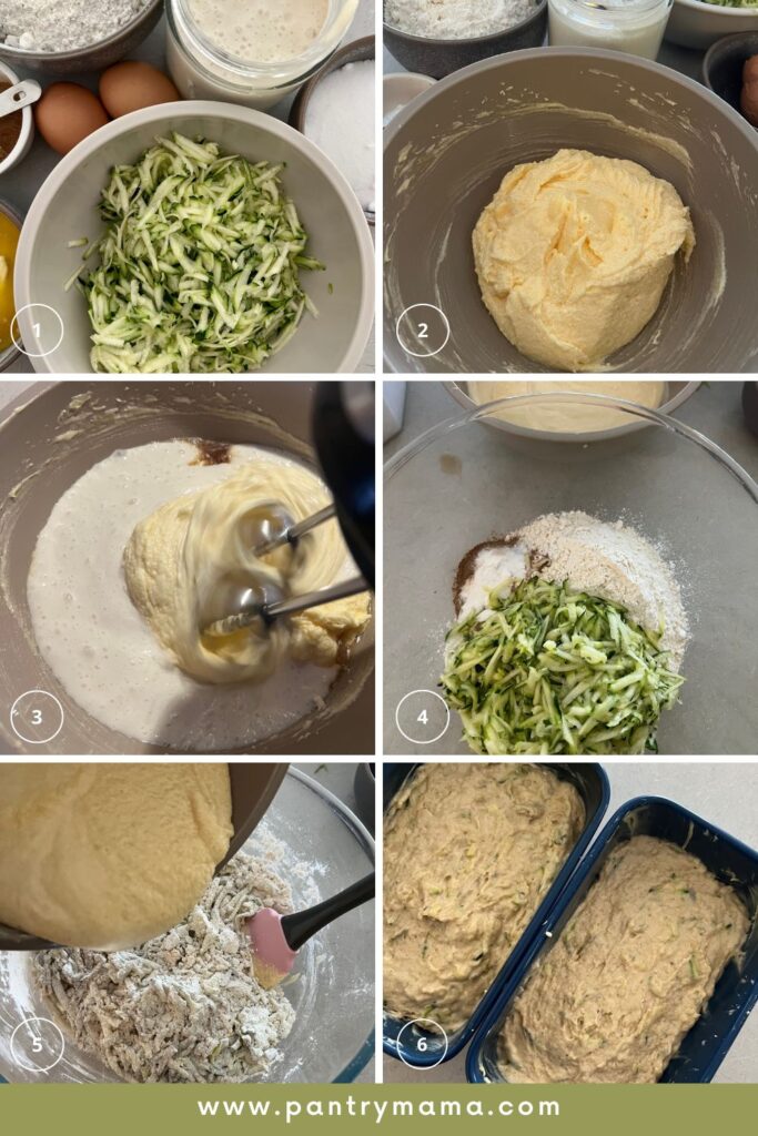 The process of making sourdough zucchini bread is really very simple. I recommend creaming the butter, sugar and eggs with a stand mixer, however, you can do it by hand if you don't have one.