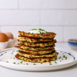 These were excellent. I only had one medium zucchini, so filled in with some grated potato. I love that you have ingredients by weight. Added herbs to our taste & cooked on my oven griddle top, so could cook many at a time. For extra crunch I sprinkled a little Parmesan on top before flipping. I made an herb sauce with mostly Greek yogurt, a little sour cream & mayo with garlic & onion powders, and dried herbs. Delicious!!