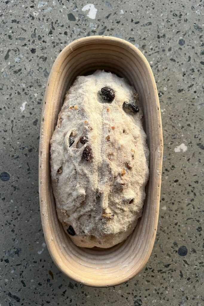 Liberally dust your banneton with rice flour to stop it sticking (if you want to add walnuts to the top of the dough, do not use rice flour. Place the walnuts in the banneton before you place the dough on top).