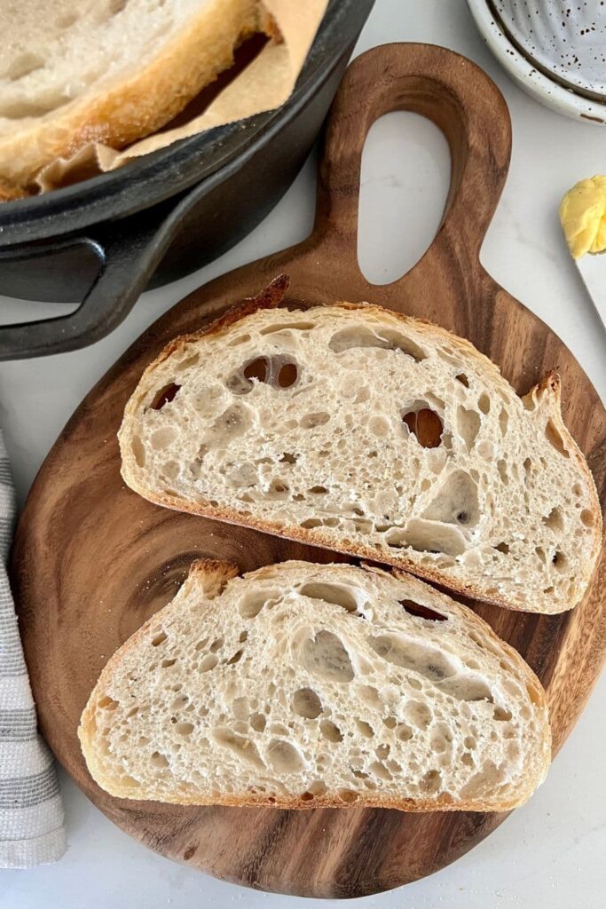 If you slice the loaf before it has fully cooled, the steam trapped inside the loaf will cause it to be wet and gummy inside. You can read more about this in my guide to slicing sourdough perfectly.
