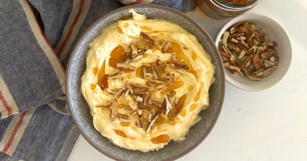 - Scrape the whipped brie butter into a bowl and drizzle in runny honey and chopped pecans.