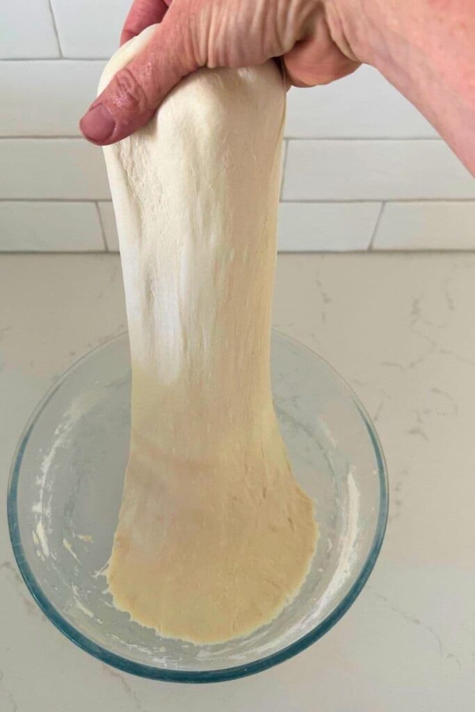 Once the dough doesn't tear when you stretch it between your fingers, you're ok to set it aside for bulk fermentation.