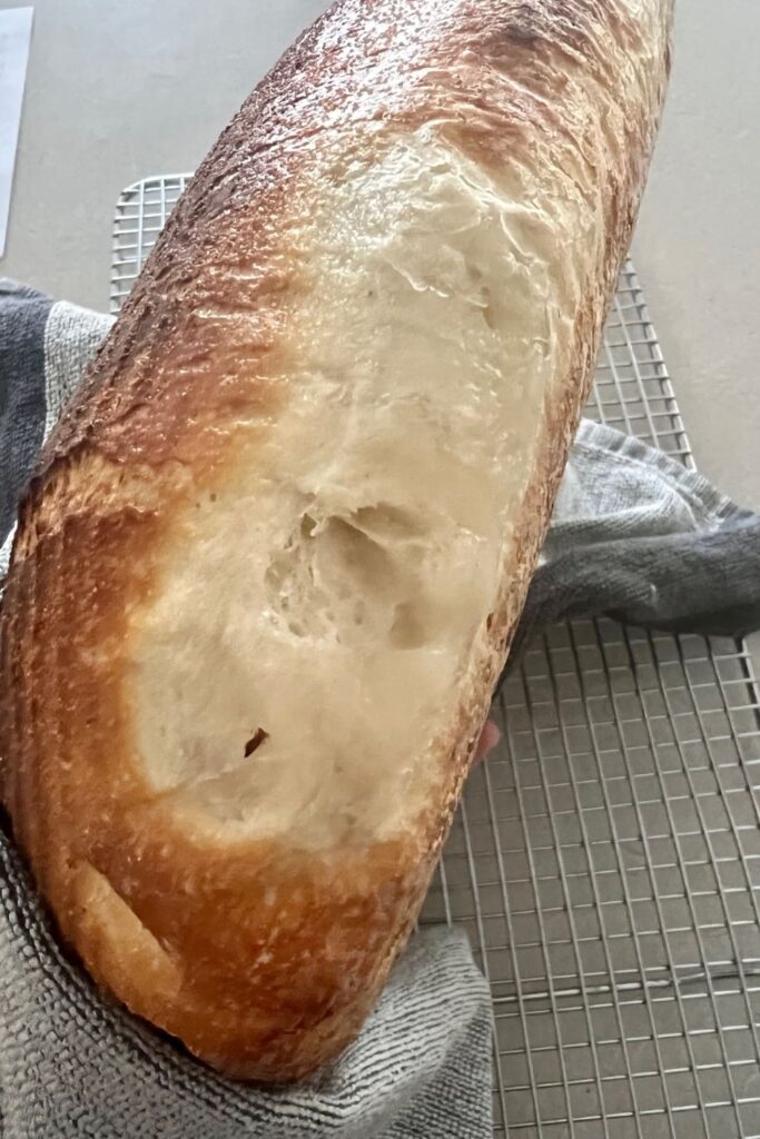 - Make sure that you give the bread adequate "lid off" bake time to ensure that the ice cubes have completely evaporated and the crust has time to get crispy.