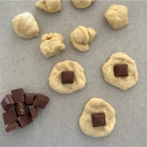 Flatten each piece of dough out into a circle, place the chocolate in the middle and then pinch the edges together. Turn the dough over and roll until the dough forms a round ball. I have used a small square of chocolate in each ball - this equates to around 6g. If using nutella, I use a teaspoon of nutella in each ball - this equates to around 10-15g.