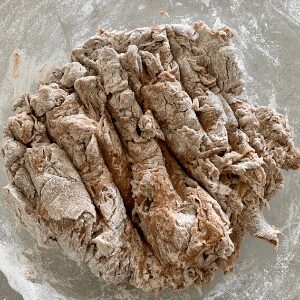 Weigh out your sourdough starter and then add the water mixture from step 1 into a large ceramic or glass bowl. Mix the water and starter together briefly. Then add your flour and salt and mix together with the end of a wooden spoon. The dough will be fairly shaggy and only just brought together.Cover your bowl with cling film or a damp tea towel and let it sit for around 1 hour. It's ok if it's a little longer.