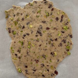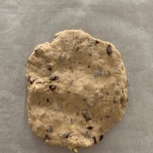 Add sourdough discard, flour, butter, maple syrup, pistachios, cranberries, spices (and salt if adding) to a mixing bowl and bring the ingredients together to form a shaggy dough.