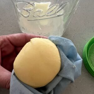Use the muslin cloth to squeeze out as much of the water as you can from the butter. The more water you squeeze out the better.