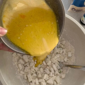 In a separate bowl mix together all purpose flour, baking powder, cinnamon and sugar. Once combined, add the diced apple and mix until all of the apple is coated in the flour mixture.