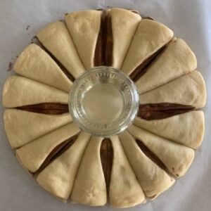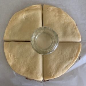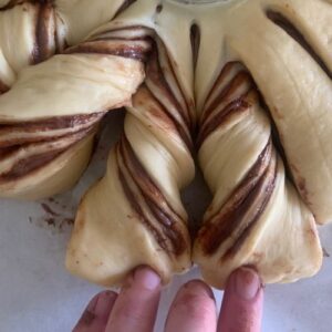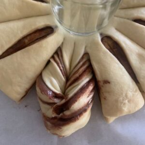 Take two pieces of dough and twist them away from each other, joining the back together at the top. Repeat this 7 more times to create 8 twists of dough revealing the nutella and making a pretty star.