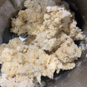 Add the sourdough starter, flour and eggs to the bowl and mix into a rough dough. Allow it to sit for 15 minutes.Don't worry if the mix appears dry, it will soften up once you add the butter.