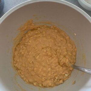 Mix all of the wet ingredients together into a large bowl. Use a fork to whisk them together into a smooth batter (include the peanut butter).