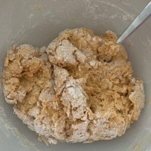 Now, add the whole wheat flour and bring together to form a rough dough. It doesn't have to be smooth and will be a little sticky.