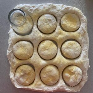 Gently press the dough into a rectangle using your hands. Using a rolling pin, gently roll your dough to around ½ - ¾ inch thick. You don't want it too thick or your muffins will be doughy and take too long to cook in the middle. Using a biscuit cutter (or glass or plastic tumbler) gently cut out rounds of your dough and place them on a baking sheet lined with parchment paper and dusted with corn meal. Keep going until you can't cut any more. Then gather up the dough, roll it back out and repeat until you've used all the dough up.Cover the muffins with a tea towel and leave to rest for around 30 minutes.