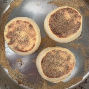Heat a fry pan or skillet on the stove top. You want a medium heat - you don't want to burn the outside and leave the inside raw, so just keep an eye on them and adjust as you need to. Place 4 - 6 muffins in your skillet, cover with the lid and cook for around 6 minutes on each side. There is no need for oil or butter, the corn meal will protect them from sticking. Turn them over once you see the dough bubbling (they will be puffed up from the heat).Once they are golden on each side, take off the heat and allow to cool. Repeat the process until all of the muffins are cooked.