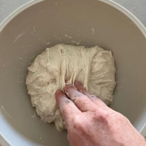 Strengthening the DoughAfter the dough has been through autolyse you need to bring it together into a ball. Work your way around the bowl, grabbing the dough from the outside, stretching it up and over itself, into the centre. You should feel the dough strengthen as you do this. It doesn't have to be perfectly smooth or tight, just work around the bowl stretching and folding (around 10 - 15 times is perfect).