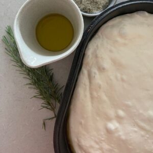 Topping:Once the dough has filled the tray and is looking puffy and full of volume, you need to dimple the dough and add the toppings.Pour olive oil over the top of the dough and then push your finger tips into the dough to create dimples. You might see some bubbles as you do this.Now sprinkle with sea salt and rosemary.