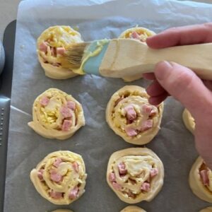 Before the sourdough pinwheels are placed into the oven, you need to brush them with melted butter.