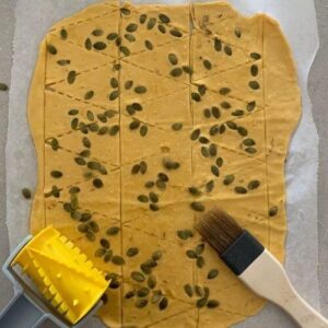 If you are going to use pumpkin seeds, sprinkle these over the dough and gently press them in using your rolling pin.