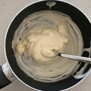 Now add 100g of warm milk. Whisk continuously until the milk starts to thicken. It should be smooth without too many lumps.