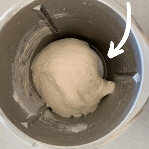 Mix the dough for another 3 minutes on Dough mode. The gluten in your dough will be well formed by now and the dough should be slapping the sides of the bowl. When you look into the bowl, you should see that there is a gap between the dough and the side of the bowl because the dough has formed a "ball". The dough will be elastic when you pull it up and have quite a bit of stretch.